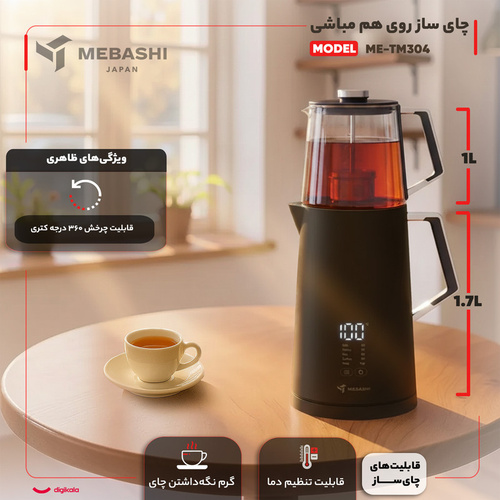 چایساز رویهم مباشی مدل ME-TM304 با طراحی کاربردی و مجموعهای از قابلیتهای کنترلی و ایمنی، انتخابی مناسب برای تهیه چای و دمنوش در خانه و محیط کار است. این مدل با ابعاد 35×20×20 سانتیمتر و وزن 2 کیلوگرم، فضای کمی اشغال میکند و برای استفاده روزمره پایداری مطلوبی ارائه میدهد. کتری دستگاه با ظرفیت 1.7 لیتر و بدنه فلزی، گرمایش سریع و دوام مناسب را تضمین میکند. قوری شیشهای 1 لیتری همراه با فیلتر استیل، امکان دمکردن چای شفاف و باکیفیت را فراهم میکند و قابلیت شستوشو در ماشین ظرفشویی برای قوری و فیلتر، نظافت را سادهتر میکند. در بخش کنترل، این مدل به پنل لمسی مجهز است و کاربر میتواند دما را از میان چهار مقدار پیشفرض انتخاب کند تا فرآیند دمآوری متناسب با نوع چای یا دمنوش تنظیم شود. قابلیت چرخش 360 درجه پایه، قرارگیری کتری را در هر زاویهای آسان میکند و طول سیم 75 سانتیمتری نیز جابهجایی و جانمایی دستگاه را راحتتر میسازد. توان 1500 واتی، جوشآوری سریع را ممکن میکند و سیستم قطع خودکار، ایمنی عملکرد را در زمان کاهش آب یا افزایش بیشازحد دما تضمین میکند. این مدل برای مصرف روزانه طراحی شده و ترکیبی از سادگی، کارایی و کنترل دقیق را ارائه میدهد.